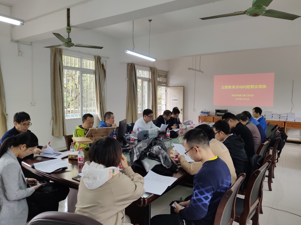 为了落实“不忘初心、牢记使命”主题教育检视问题的整改措施,2019年11月16日上午,环境学院教工第三党支部在屏风校区12306召开支部党员大会,覃礼堂同志主持会议,环境工程教研室全体教师(包括支部党员)参加本次会议。参会人员针对主题教育活动中所检视的问题,研讨整改措施并形成整改方案。