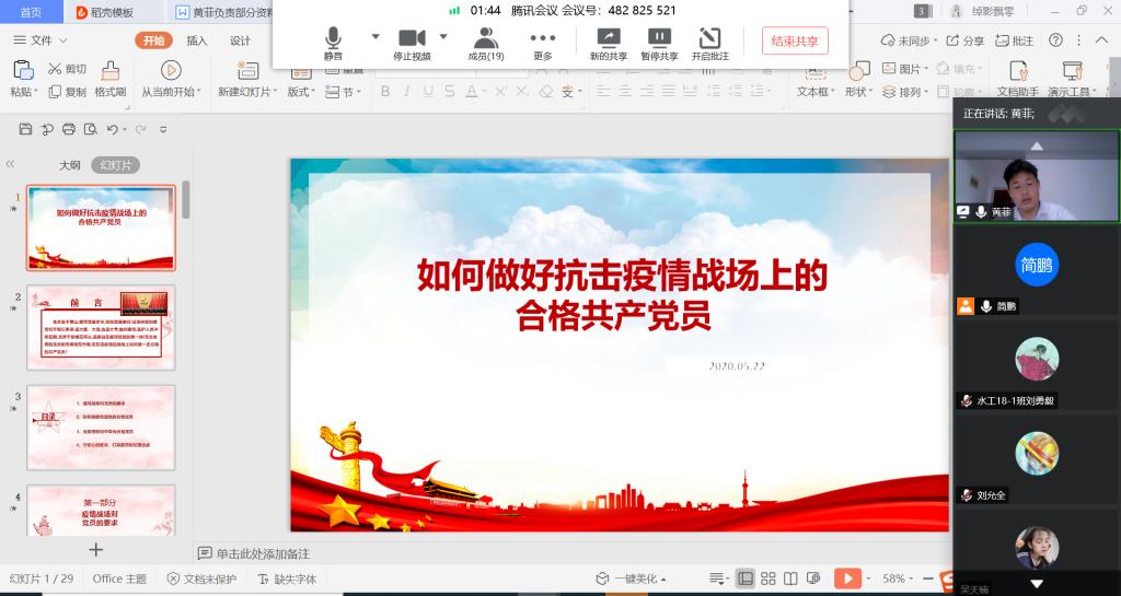 5月22日,我院本科生四支部利用腾讯会议APP开展“如何做好抗击疫情战场上的合格共产党员”线上专题党课教育活动。支部书记杨平平同志主持会议,全体支部党员和发展对象参加会议。
