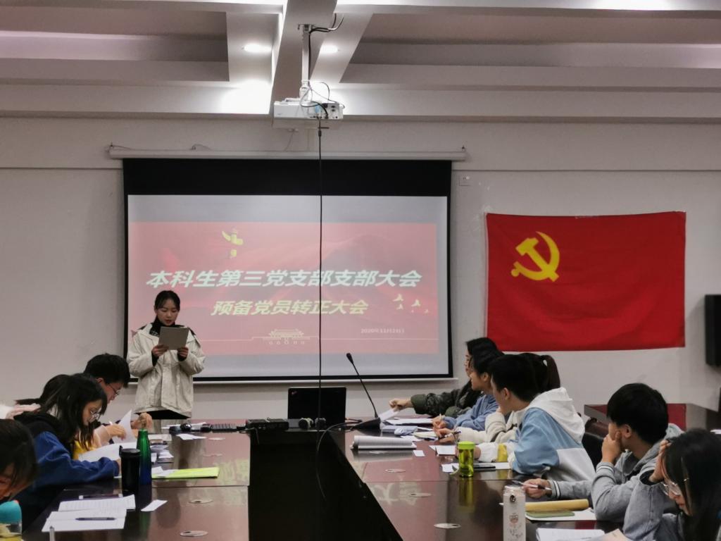 11月23日晚,我院本科生第三党支部在雁山校区12407会议室组织召开预备党员转正大会,本次会议由党支部副书记张颖颖主持会议,全体党员同志参加会议。大会主要讨论杨诗琪、唐栎涵、代彬、连英涵、王紫维、黄慧敏和龙飘七名同志转正的问题。