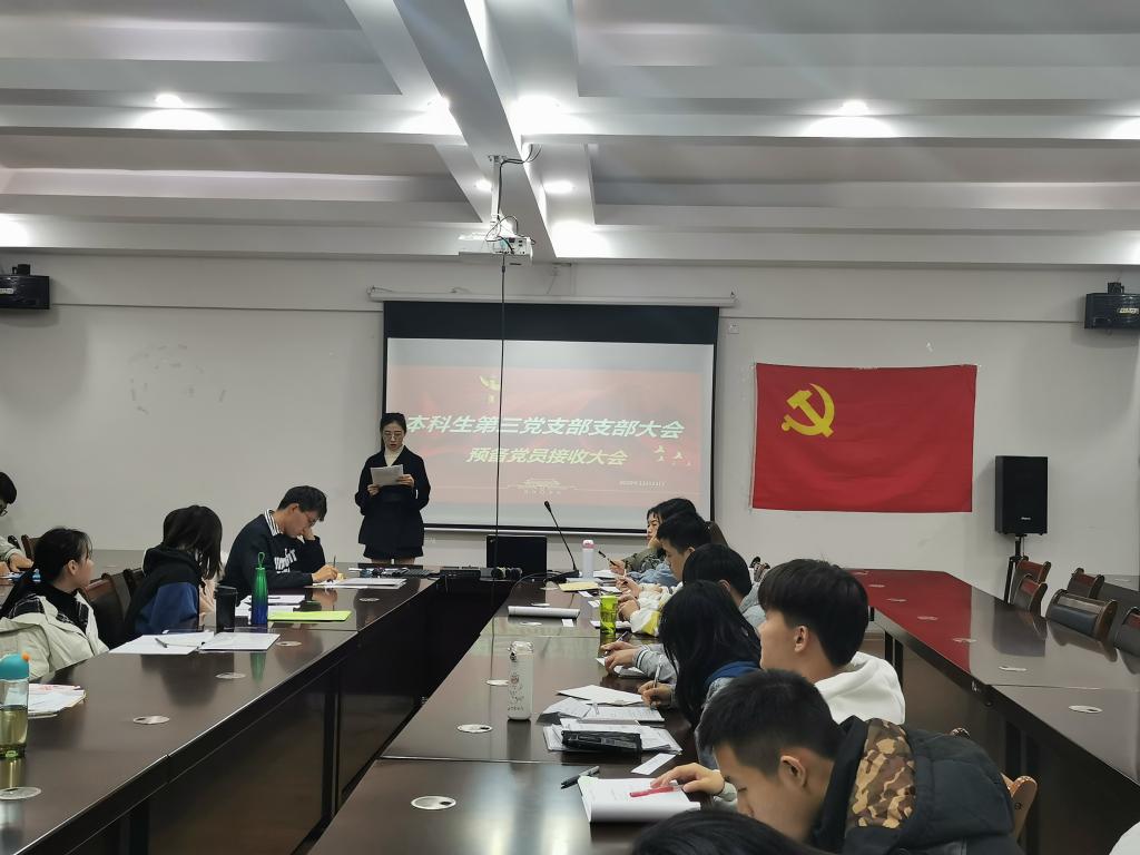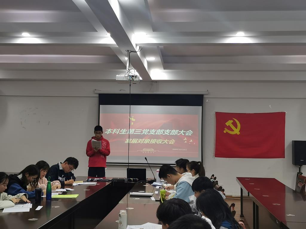 11月23日晚,我院本科生第三党支部在雁山校区12407会议室召开2020年秋季学期预备党员接收大会,会议由党支部副书记张颖颖同志主持。会议主要讨论关于接收韦耀镕、黎威、崔贞雍和王蓉四名同志为中共预备党员的相关问题。除一人请假外支部全体党员同志参加了本次会议。