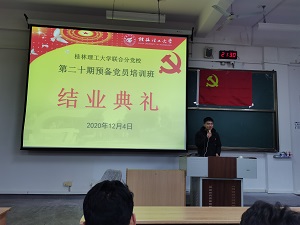 结业典礼上,潘泓序老师表示党校培训的圆满结束离不开各位领导、老师的高度关注与辛勤付出,也离不开每一位同学的努力。同时,潘泓序老师也表达了对本次党课学员的衷心祝贺,也对学员们给予了殷切希望并要求学员们在今后学习生活中能加强学习,进一步提高党性修养,自觉学好专业知识,历练本领,以实际行动争取早日入党。