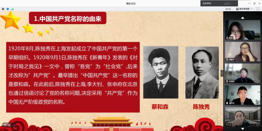今年适逢中共百年华诞,是十四五开局起步之年,习近平总书记强调:“注重用党的奋斗历程和伟大成就鼓舞斗志、明确方向,用党的光荣传统和优良作风坚定信念、凝聚力量,用党的实践创造和历史经验启迪智慧、砥砺品格”。本次党日活动从三个时期作为引入,分别从新民主主义革命时期,社会主义革命和建设时期,改革开放和社会主义现代化建设新时期带大家回顾了一些在党的历史上具有重大意义的事件。我们党的百年历史,就是一部践行党的初心使命的历史,就是一部党与人民心连心、同呼吸、共命运的历史。习近平总书记指出:在全党集中开展党史学习教育,正当其时,十分必要。作为新时代大学生党员,要树立正确的党史观,带头主动学习党史,推动党史学习教育深入人心。