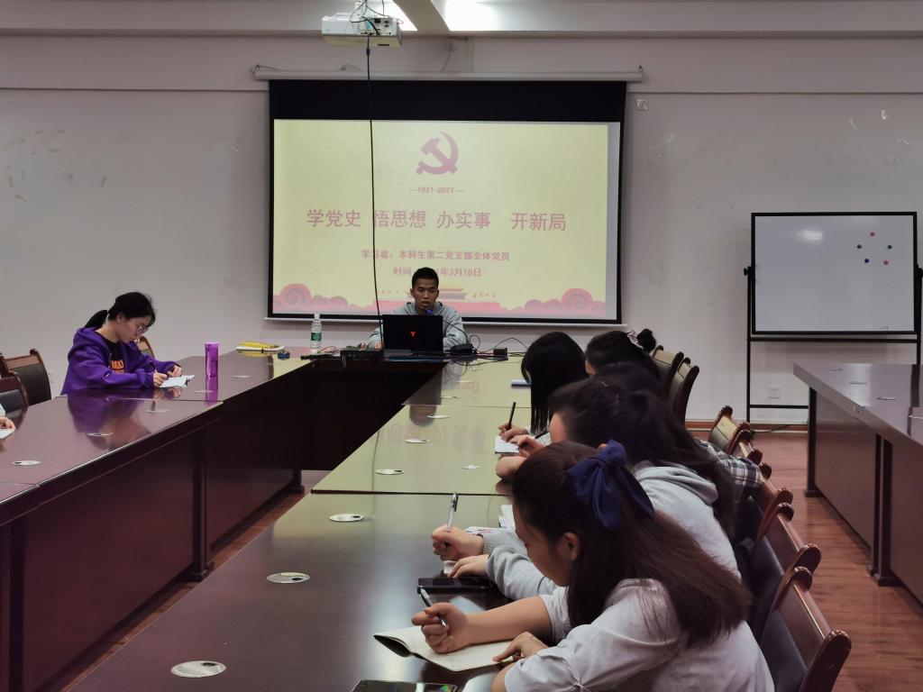 2021年3月18日晚,beat365手机版官网入口本科生第二党支部在12407开展党史学习教育,支部党员参加会议,会议由支部副书记杨智钧同志主持。