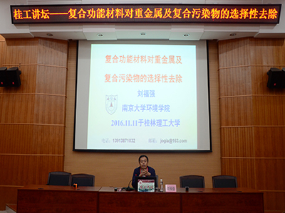 在母校六十华诞到来之际,应我院邀请,1995级校友、南京大学博士生导师刘福强教授在雁山校区萃华楼一楼的广西矿冶实验中心报告厅做了题为“复合功能材料对重金属及复合污染物的选择性去除”的学术报告会,相关专业的师生100余人参加会议。